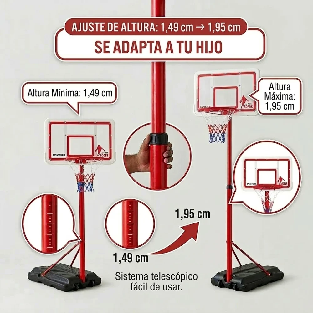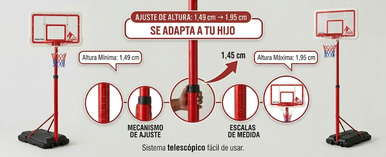 ¡Sí! Gracias a su sistema telescópico, puedes regular la altura fácilmente desde los 1,49 cm hasta los 1,95 cm. Esto permite que la canasta «crezca» con tu hijo y sea apta para diferentes edades y niveles de habilidad.