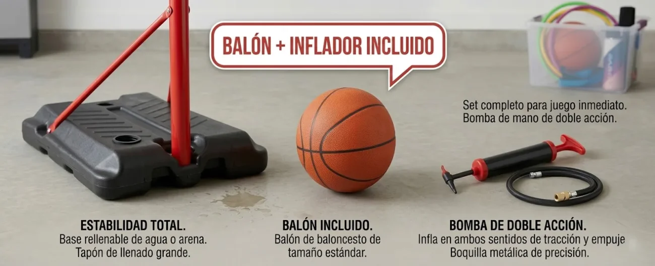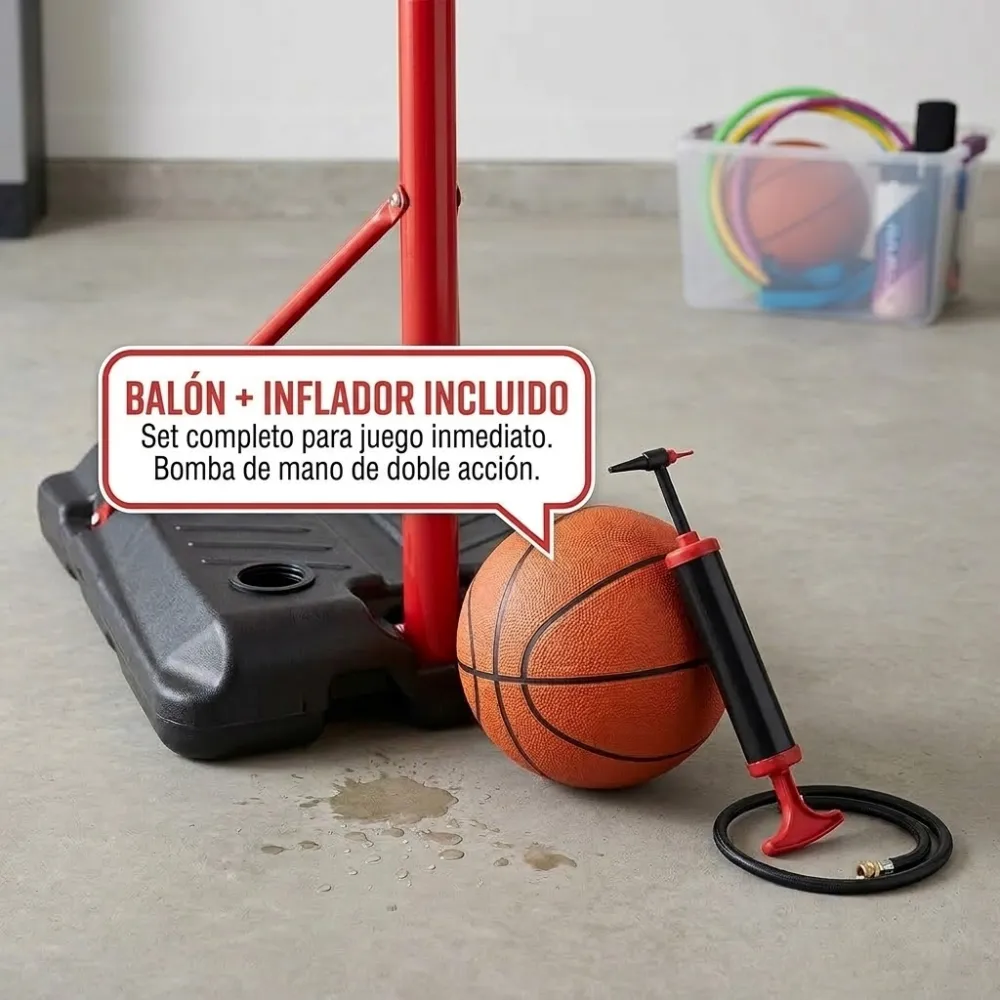 El set incluye un balón de baloncesto de tamaño estándar (generalmente Talla 7), adecuado para la práctica recreativa, junto con un inflador de mano para que puedas empezar a jugar en cuanto termines el montaje.