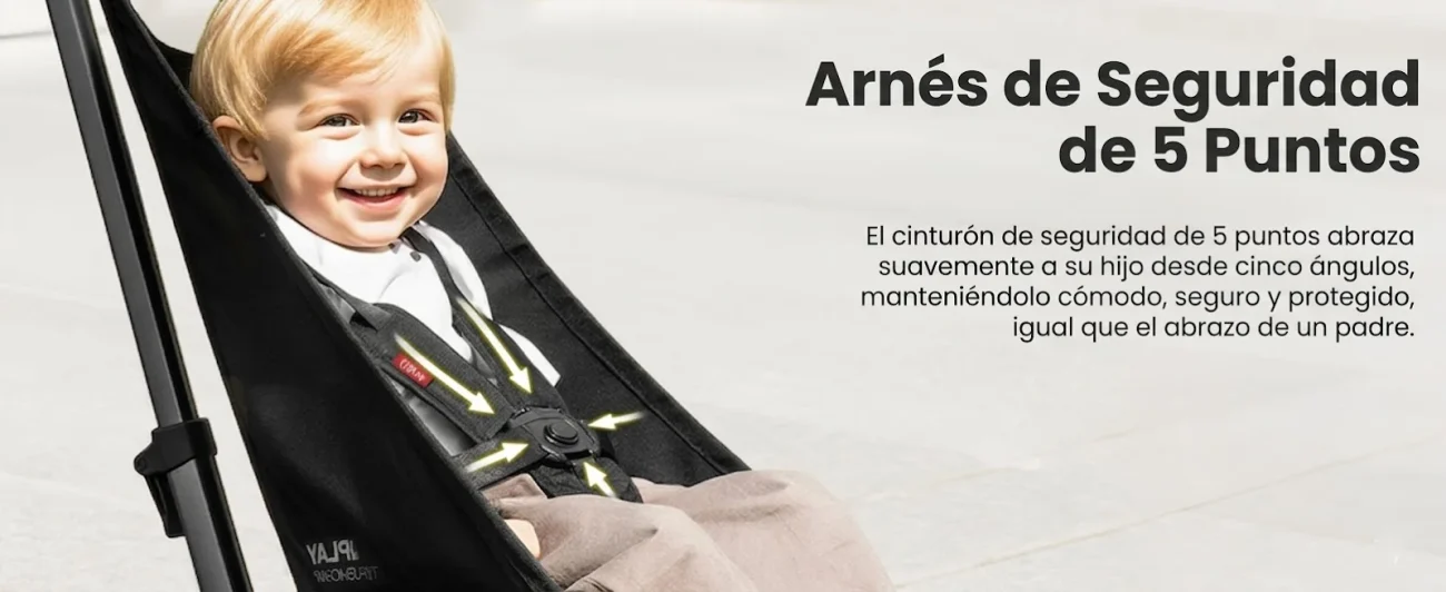 Equipada con arnés de seguridad de 5 puntos y sistema de freno sincronizado, garantiza estabilidad y protección en cualquier superficie.