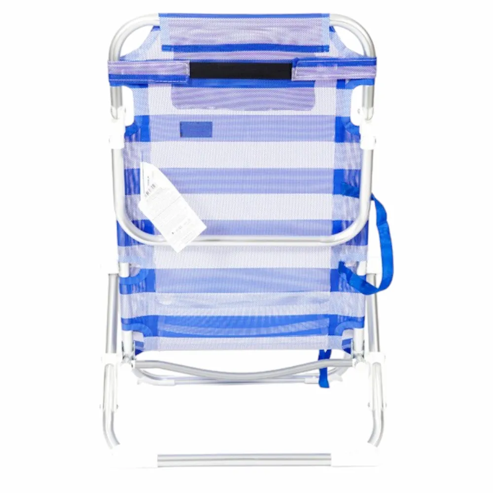 Disfruta del verano con esta práctica silla plegable de playa y camping, diseñada para ofrecerte confort en cualquier entorno al aire libre. Su estructura metálica en color plata es resistente y ligera, mientras que la tela en rayas azules le da ese toque clásico de verano que nunca pasa de moda.