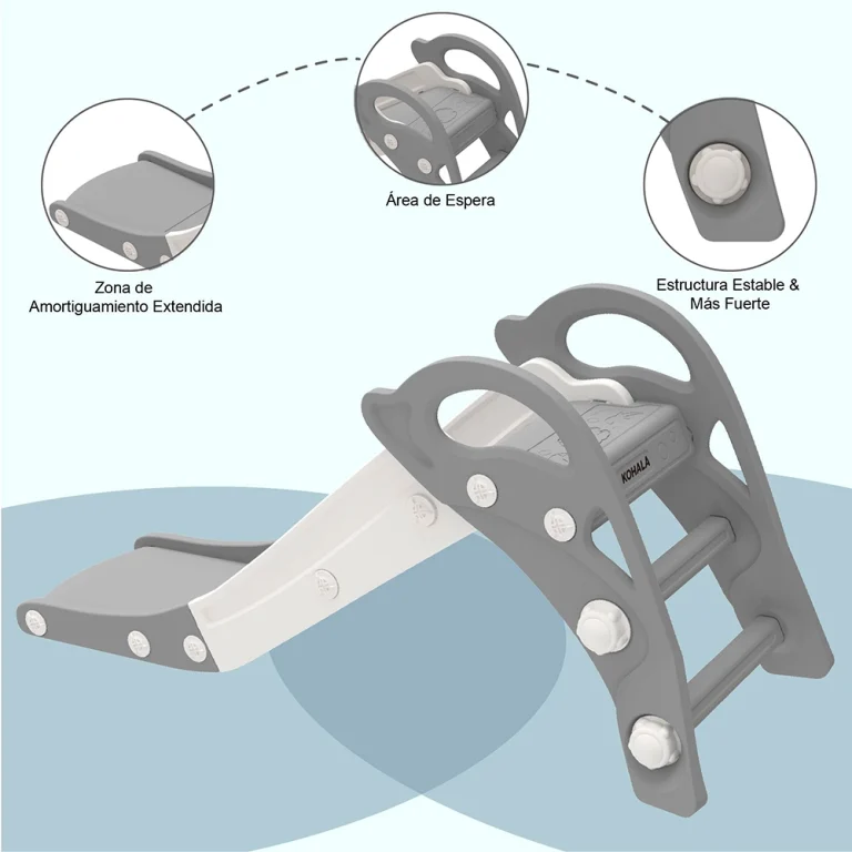 Escaleras antideslizantes, longitud extendida del tobogán con zona de protección y pasamanos de fácil agarre para mayor seguridad.