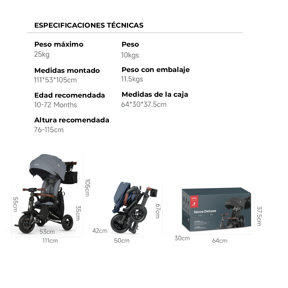 Descubre la versatilidad y el estilo con el triciclo Qplay Nova Deluxe, diseñado para acompañar el crecimiento de tu peque desde los 10 meses hasta los ~6 años* (aprox. 72 mes) con un límite de peso recomendado de hasta 25 kg.