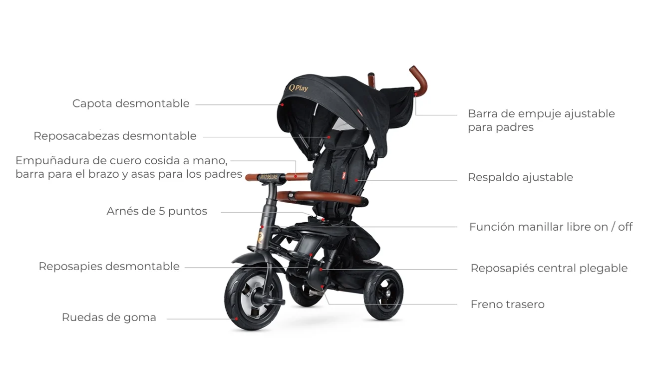 El triciclo cumple con las normas de seguridad europeas, incluyendo un cinturón de seguridad acolchado de 5 puntos, bloqueo de ruedas traseras y cubierta protectora en la rueda delantera para evitar lesiones.