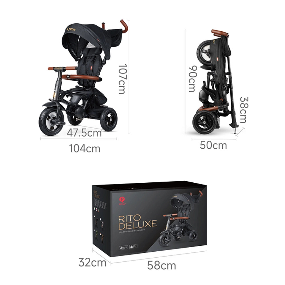El triciclo Rito Deluxe cuenta con una de las funciones de plegado más simples del mercado. Con solo dos clics, se pliega completamente, permitiendo que quepa en el maletero del coche, en transporte público o incluso como equipaje de mano en un avión. - Crece con tu hijo
