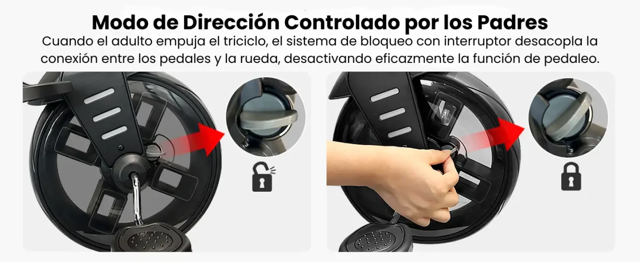 - Función de rueda delantera: la rueda delantera está equipada con una función de encendido y apagado, que simplifica el control y la estabilidad del triciclo.